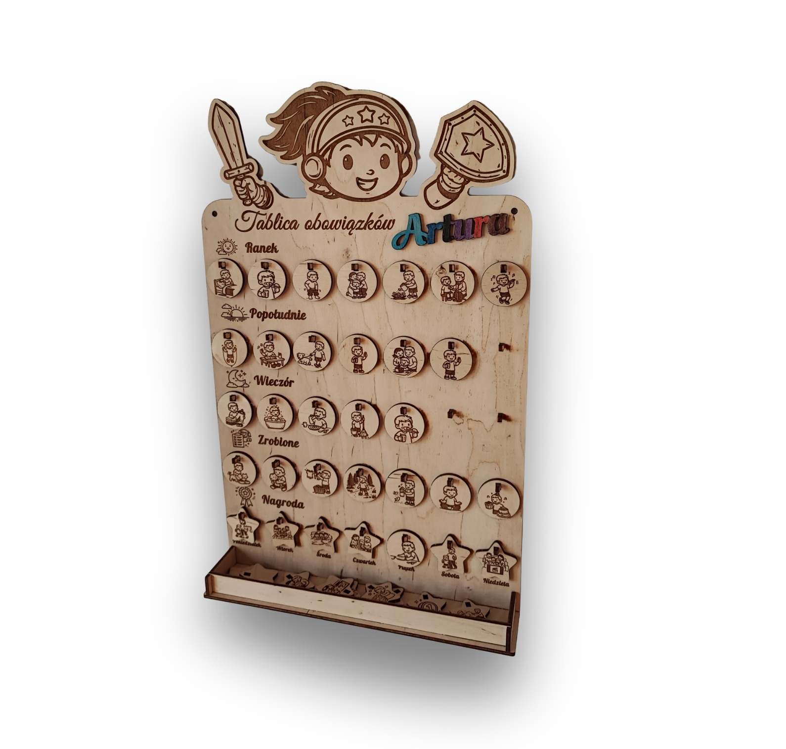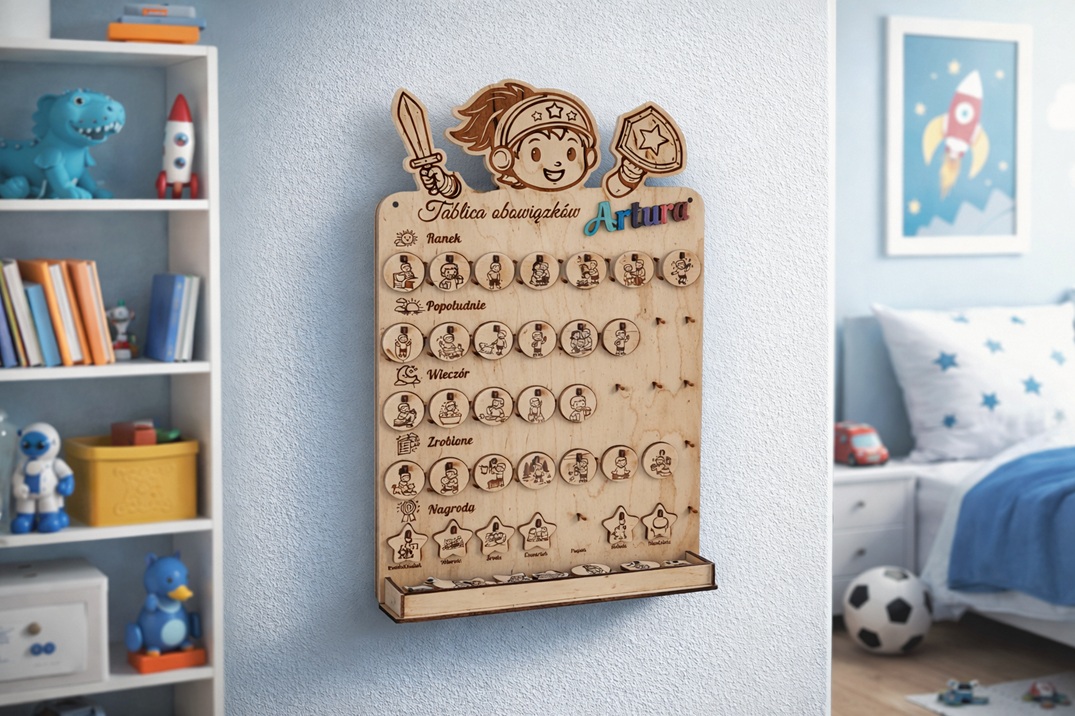 Ta personalizowana tablica zadań to sprytne narzędzie, które uczy dziecko odpowiedzialności, systematyczności i samodzielności w sposób naturalny i atrakcyjny.