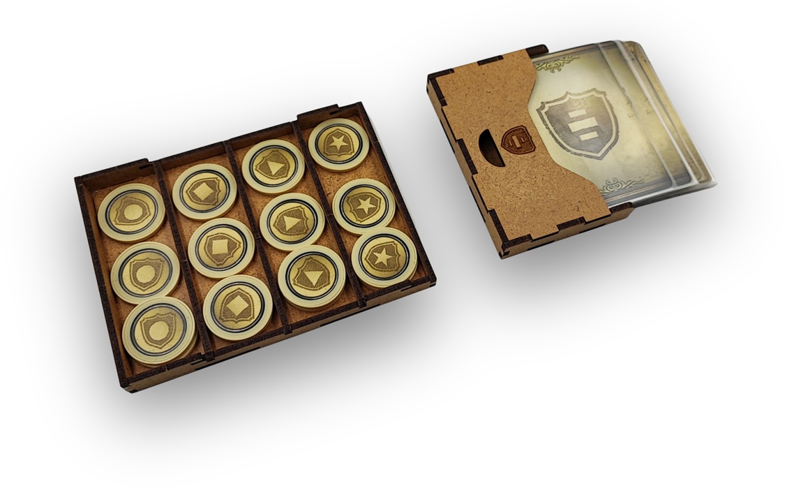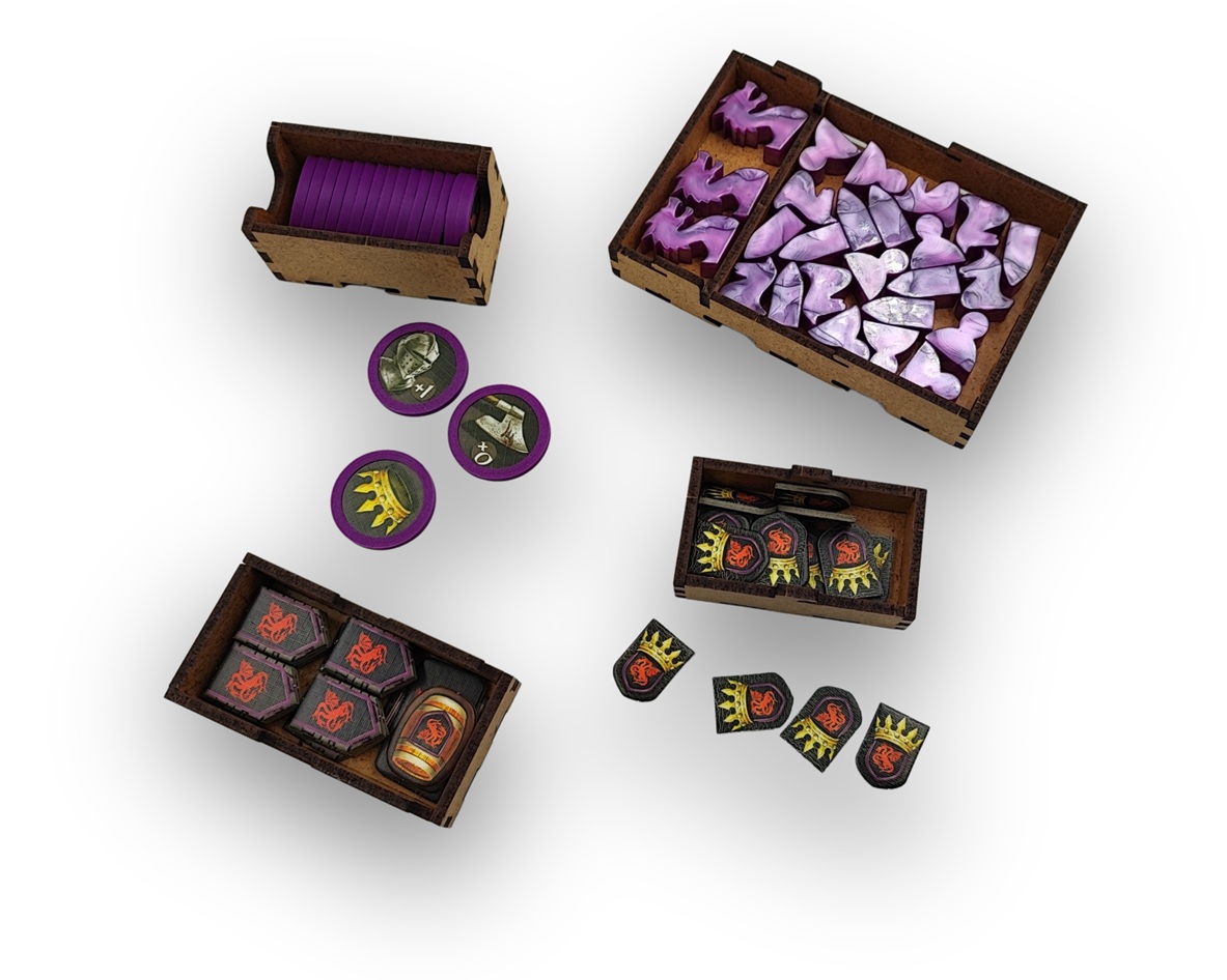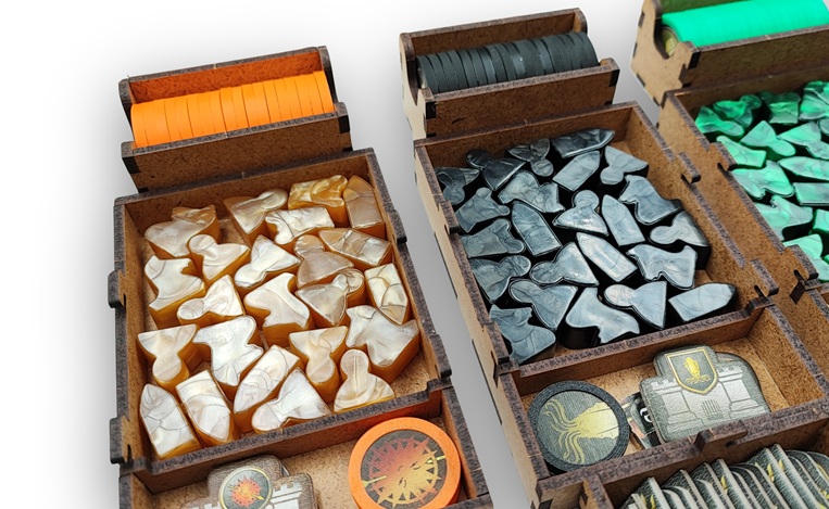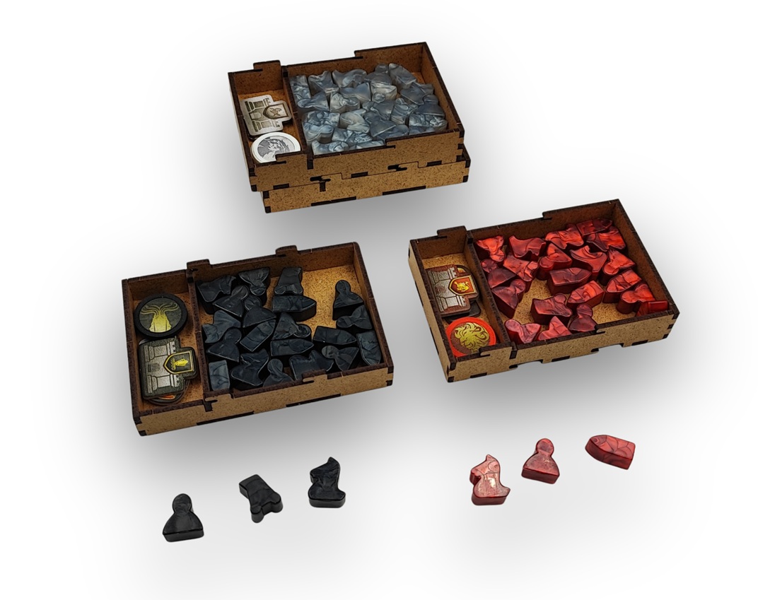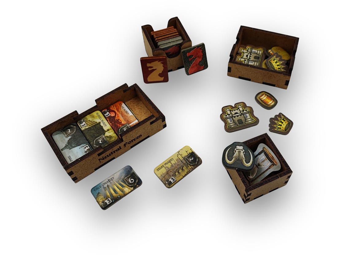 • 8 pojemników na elementy gracza (jednostki, żeton zaopatrzenia, żeton zwycięstwa, żetony wpływów) – górne pojemniki posiadają pokrywkę z pleksi
