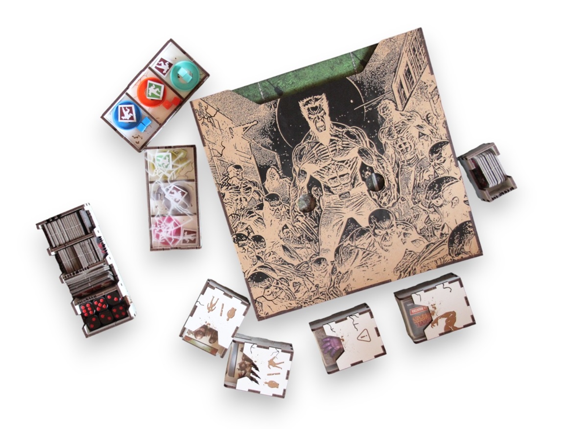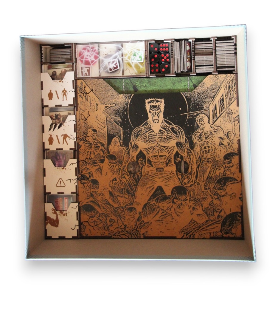 Bardzo dobry funkcjonalny Insert, podobnie jak insercie do gry Marvel Zombies, grawery i wycięcia dodają mega klimatu na stole. A pudełko na kafle z grawerem to mistrzostwo świata .